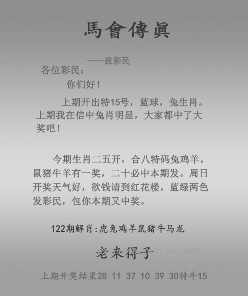 | 122期:马会传真解析: 今期生肖二五开,合八特码兔鸡羊 鼠猪牛羊有一奖,二十必中本期发 周日开奖天气好,欲钱请到红花楼 蓝绿两色发彩民,包你本期又中奖 老来得子 解:今期生肖二五开,合八特码兔鸡羊,明肖兔鸡羊,鼠猪牛羊有一奖,二十必中本期发,明肖鼠猪牛羊,20狗,周日开奖天气好,欲钱请到红花楼,蓝绿两色发彩民,包你本期又中奖,蓝绿。 综合生肖:兔鸡羊鼠猪牛狗虎马 |